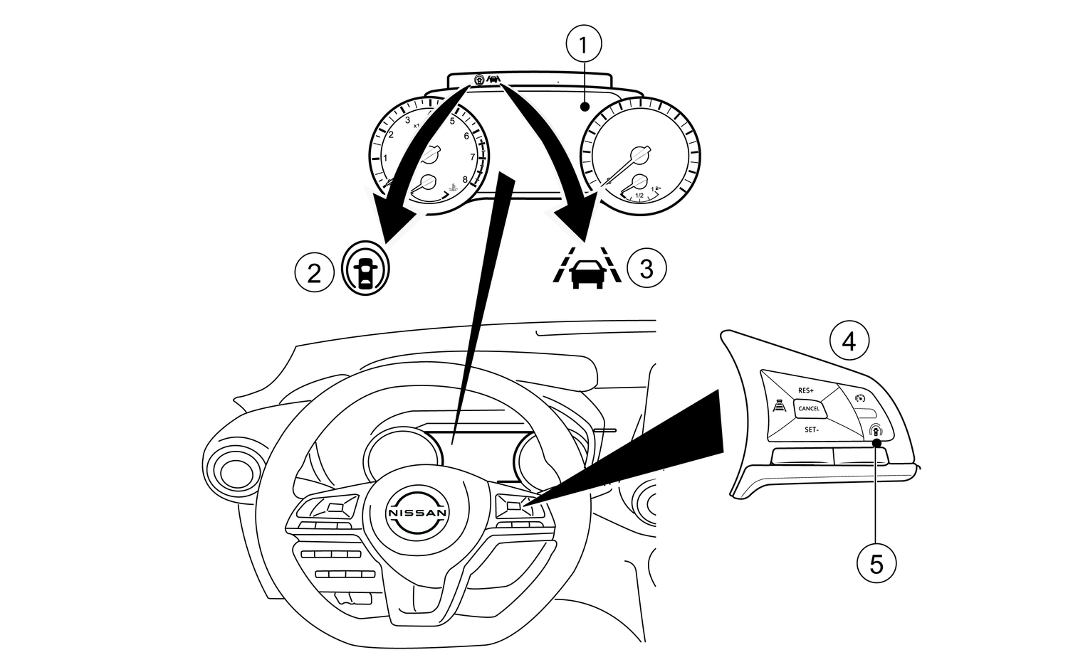 - (3)Indicatore ILI (nel display informativo multifunzione). Appare solo quando il sistema si attiva (lampeggia con luce gialla).
