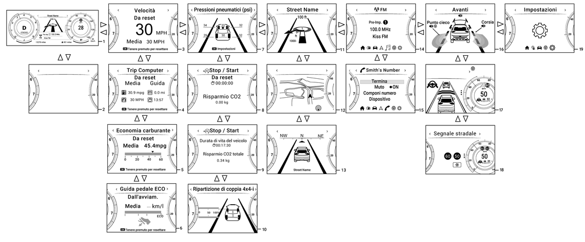 Quando l'accensione è ON, il display informativo multifunzione può visualizzare le schermate seguenti, se in dotazione al veicolo: