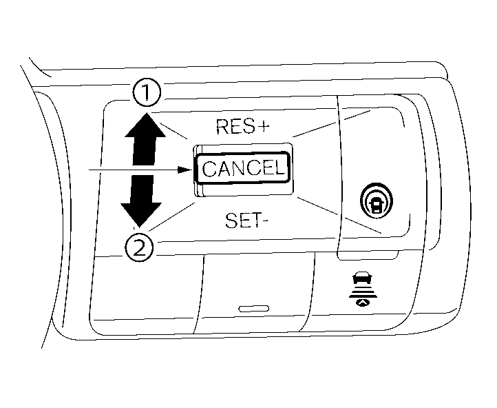 Push down and hold the <CANCEL> switch to SET- (2). The vehicle set speed decreases in increments of 10 km/h or 5 MPH.